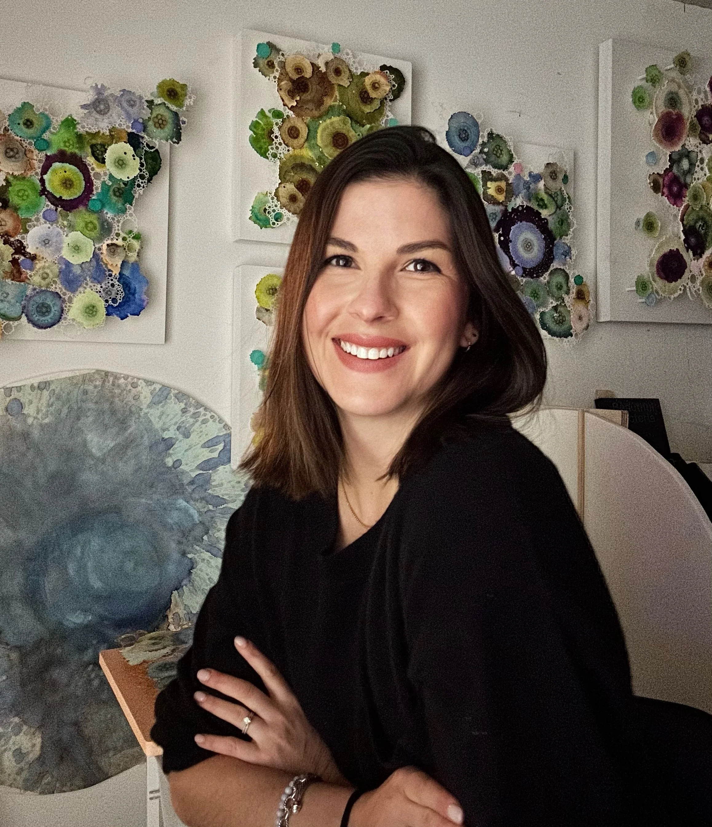 Heather meticulously drips and paints ink onto synthetic paper, creating shapes that flow organically of their own volition. She melts them with a soldering iron - guiding them into sophisticated, collaged formations. Heather’s work is finished on hand soldered backgrounds comprised of hundreds of intricate holes and hand drilled into panel. The result is a sculptural mixed media process that feels both meticulous and organic. Her work celebrates the grounded yet intricate nature of cellular structures, reflecting the quiet complexity that underlies all life and design.